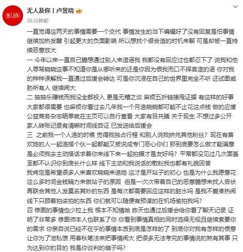 1、回应造谣辱骂与误解:否认存在和他人辱骂卢昱晓的行为,称相关说法是不实谣言;表示今年以来一直忍受着他人的臆想造谣,曾通过后援会转达对自己的误解,但对方拒不听取,还试图威胁他人扩大事态。